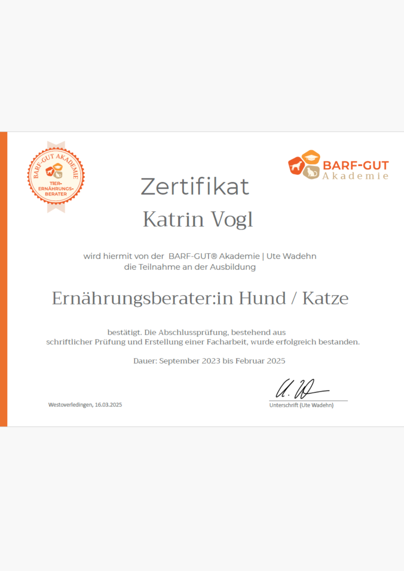 10/23 - 11/24: Ausbildung zur Ernährungsberaterin für Hund/Katze bei Barf-Gut-Akademie (Ute Wadehn)