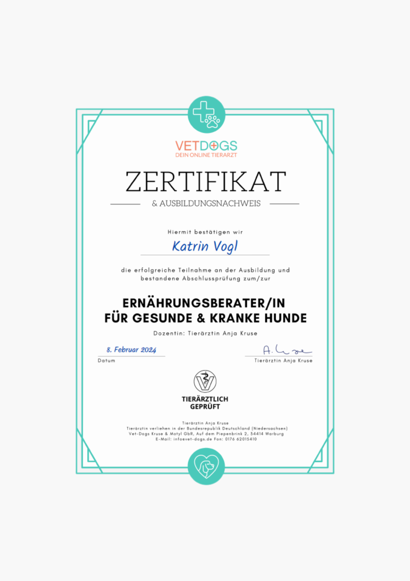 04/23 - 10/24: tierärztlich geführte Ausbildung zur Ernährungsberaterin für gesunde und kranke Hunde bei vetdogs (Anja Kruse)
