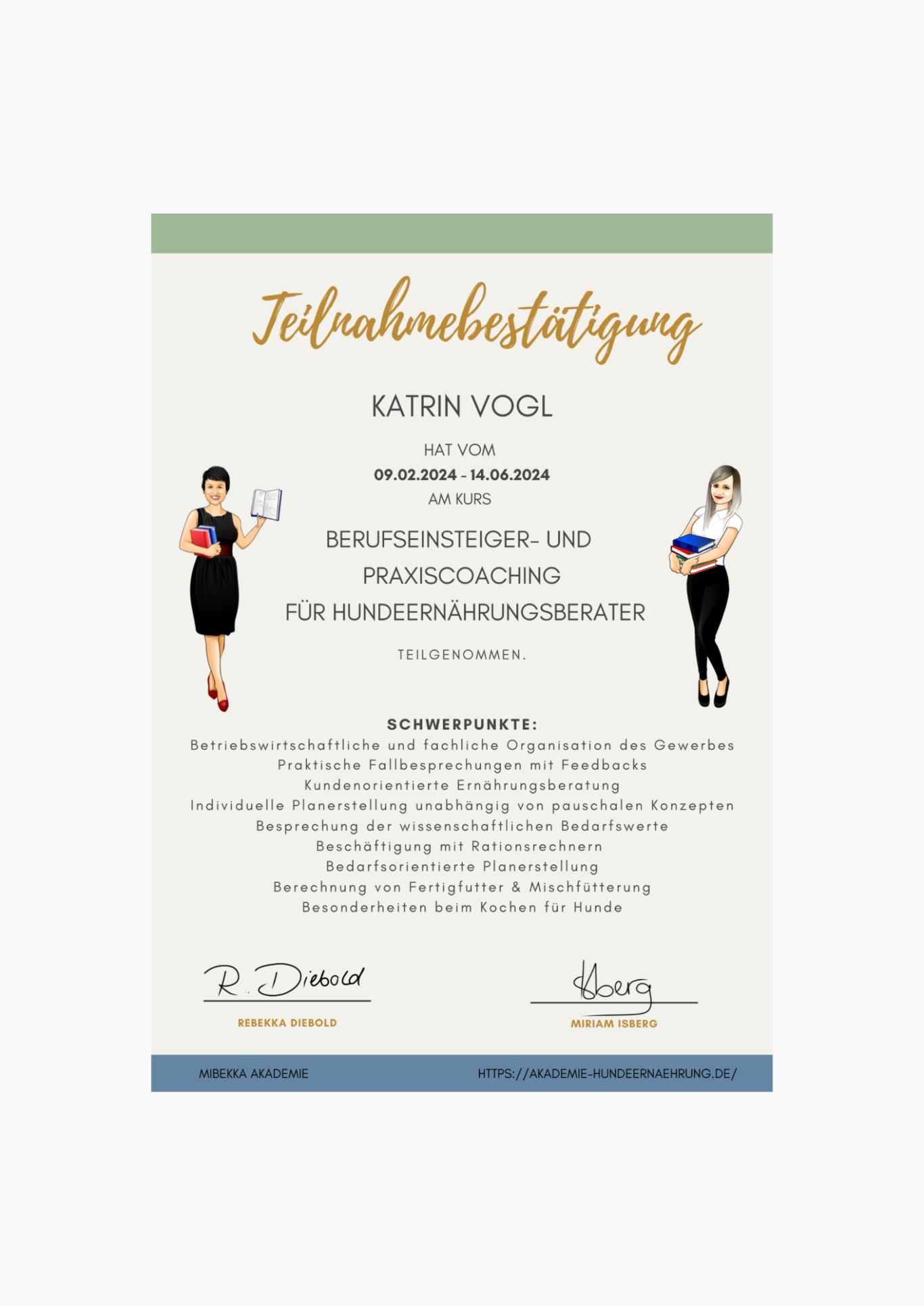 seit 07/24: Einzelcoaching für Hundeernährungsberater bei Mibekka Akademie (Miriam Isberg & Rebekka Diebold)