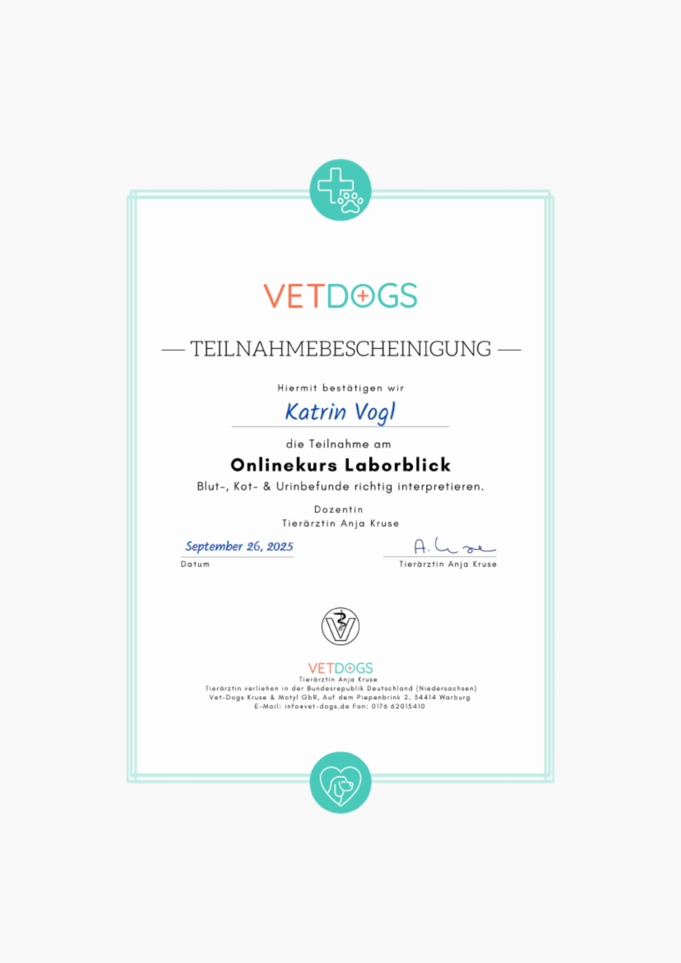 03/25 - 10/25: tierärztlich geführter Laborkurs - Befunde korrekt und sicher interpretieren bei vetdogs (Anja Kruse)