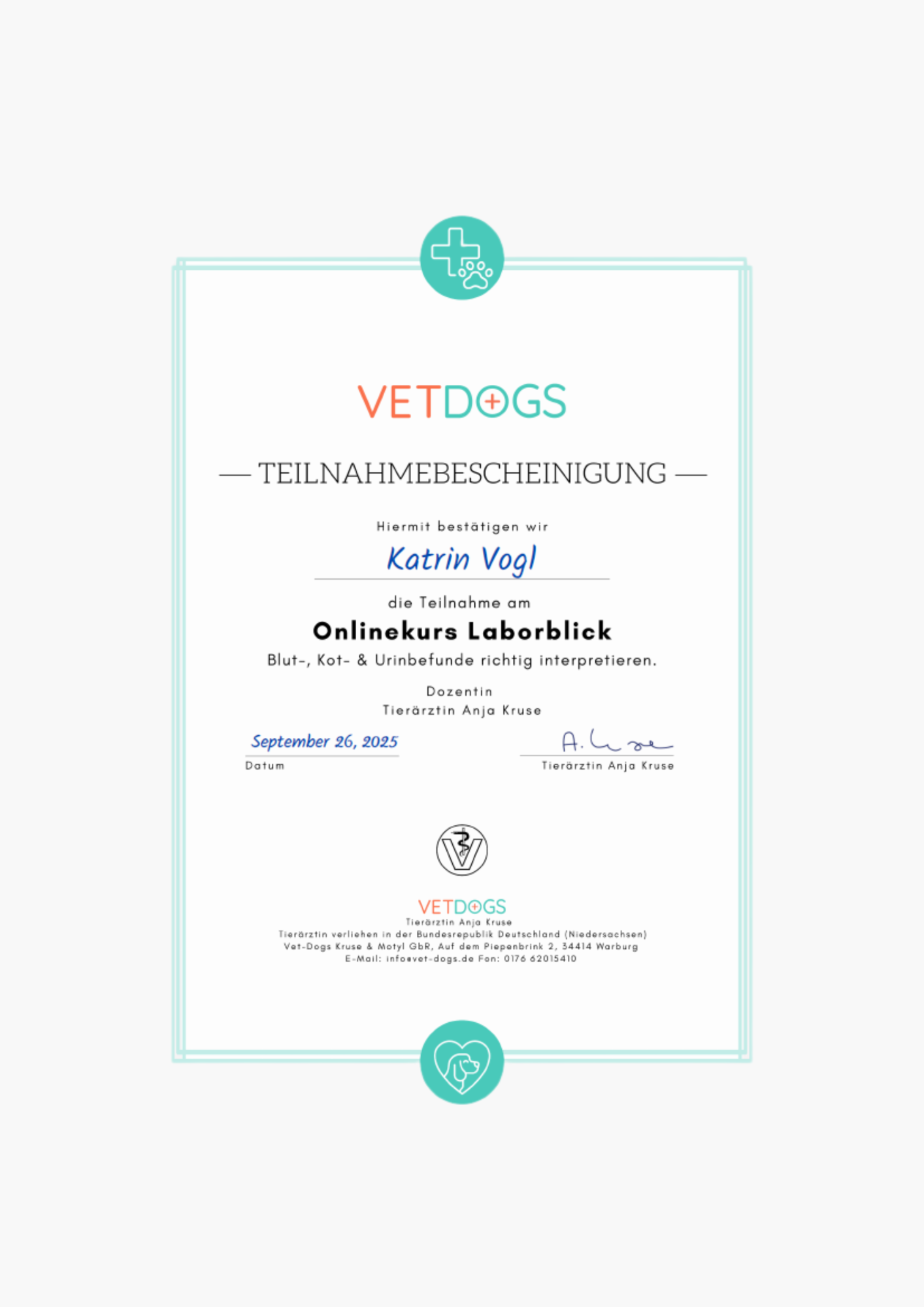03/25 - 10/25: tierärztlich geführter Laborkurs - Befunde korrekt und sicher interpretieren bei vetdogs (Anja Kruse)